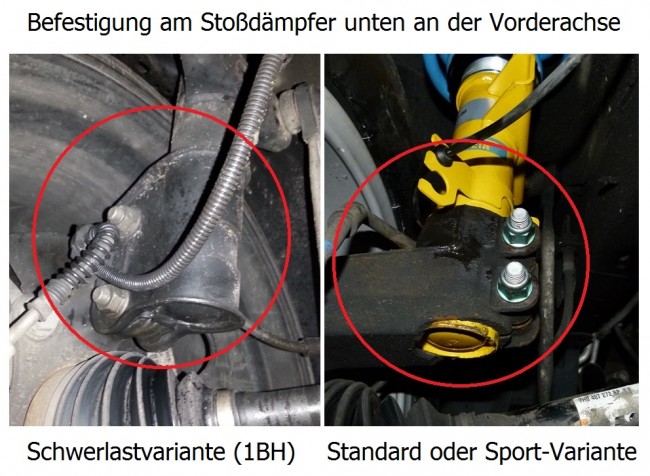 Das KW-Gewindefahrwerk für VW Bus T5, T6 und T6.1 (incl 4Motion) gibt es für das Standardfahrwerk und Schwerlastfahrwerk. Den Unterschied sehen sie hier auf dem Bild. Rechts ist der Standard-Dämpfer mit dem durchgesteckten Dämpfer / Federbein im Achsschenkel (Klemmbefestigung, Schrauben sind motorseitig), und links ist der Schwerlast-Stoßdämpfer in einem Teil mit der Halterung (Schellenbefestigung, Schrauben sind radseitig).